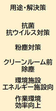 - 抗菌・抗ウイルス対策:オゾン・光触媒・深紫外線LED・エアシャワールーム・光触媒インテリア・除菌ロッカー
