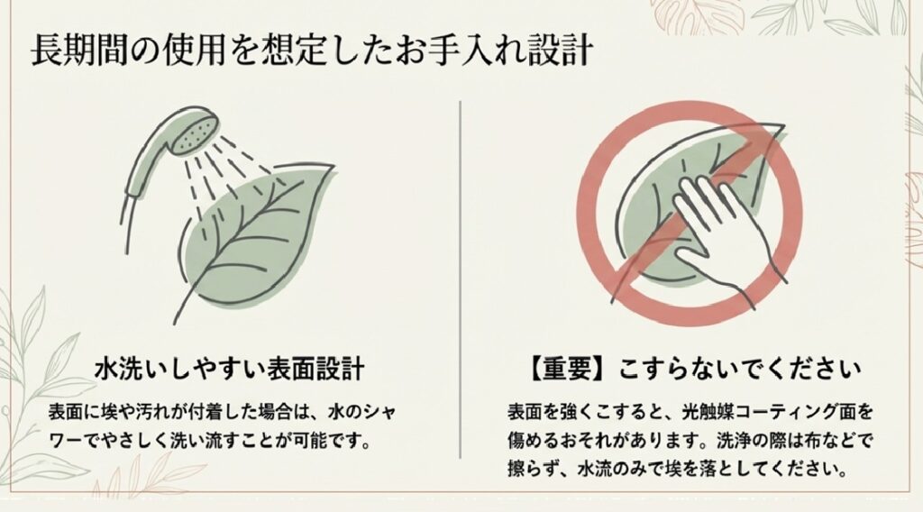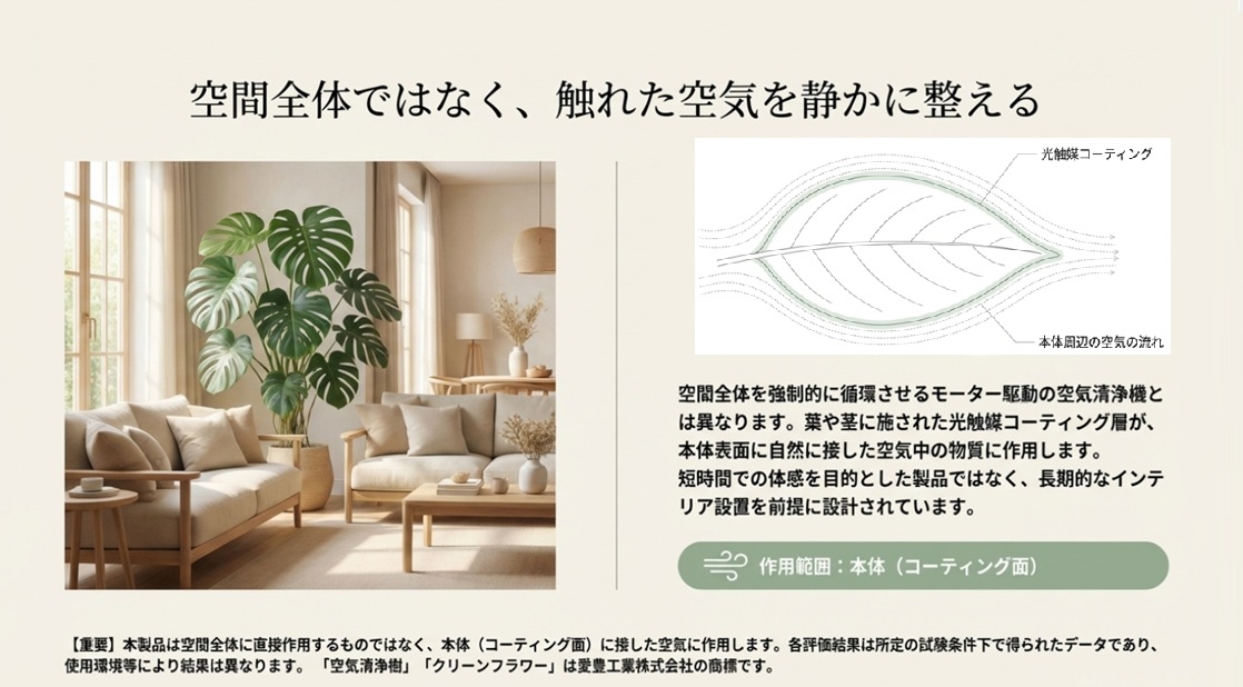 本製品は、葉や花の表面にこの光触媒コーティングを施しています。作用範囲は本体(コーティング面)に接した空気のみです。