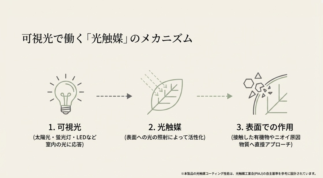 光触媒とは、太陽の光や蛍光灯・LEDなどの「光」に反応する性質を持つ技術です。