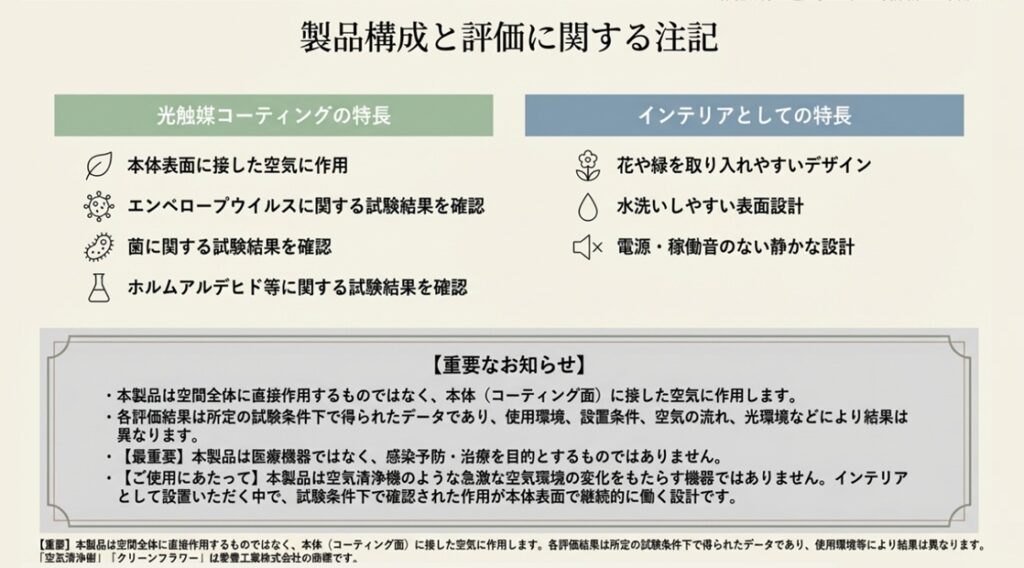 ・本製品は商品名に「空気清浄」「クリーン」の語を含みますが、空気清浄機としての性能を保証するものではなく、光触媒コーティングを施したインテリア製品です。